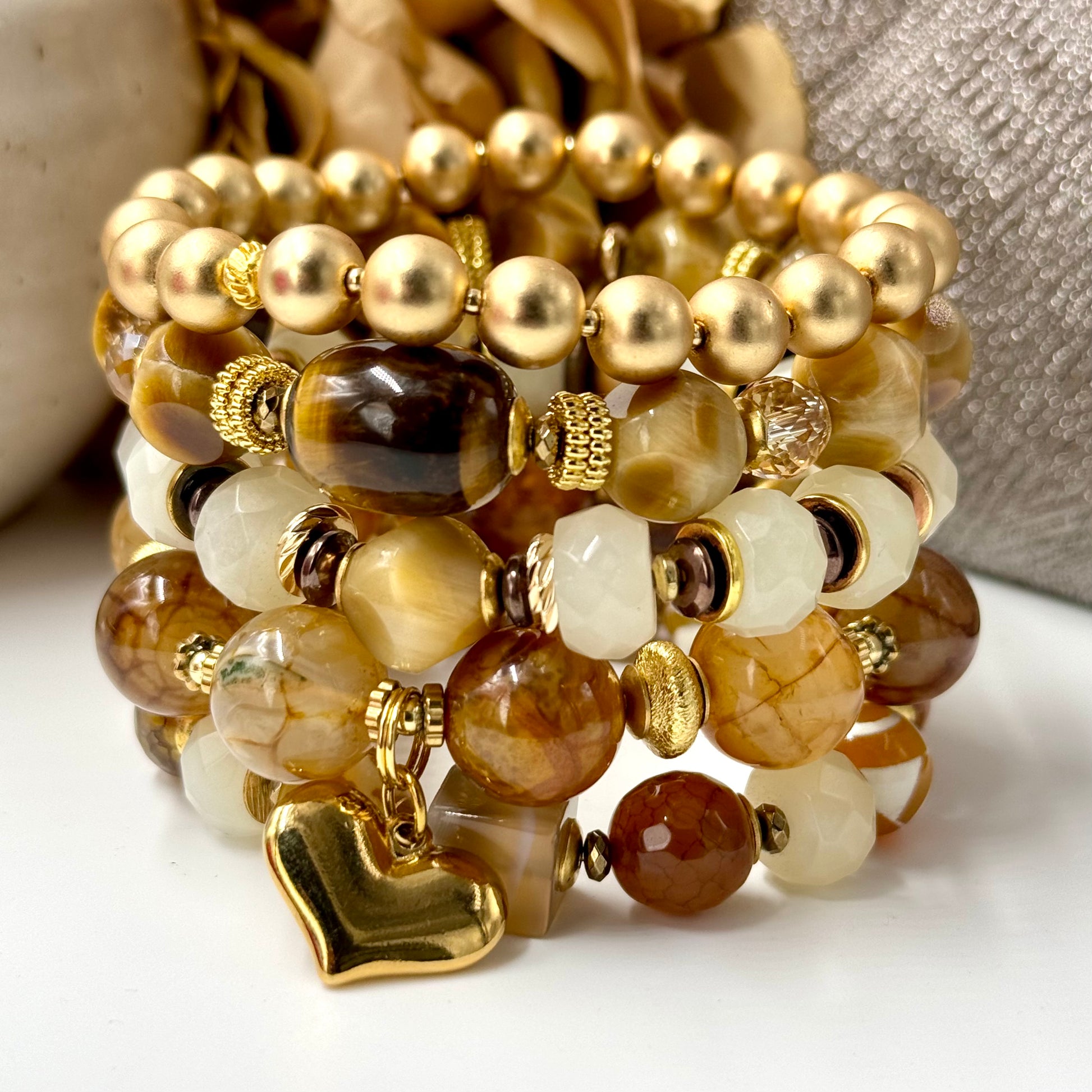 The Golden Collection features 8, 10, 12 and 14mm beads and the following gemstones: Gold Tiger Eye, Fire & Tibetan Agate, White Jade and Hematite.