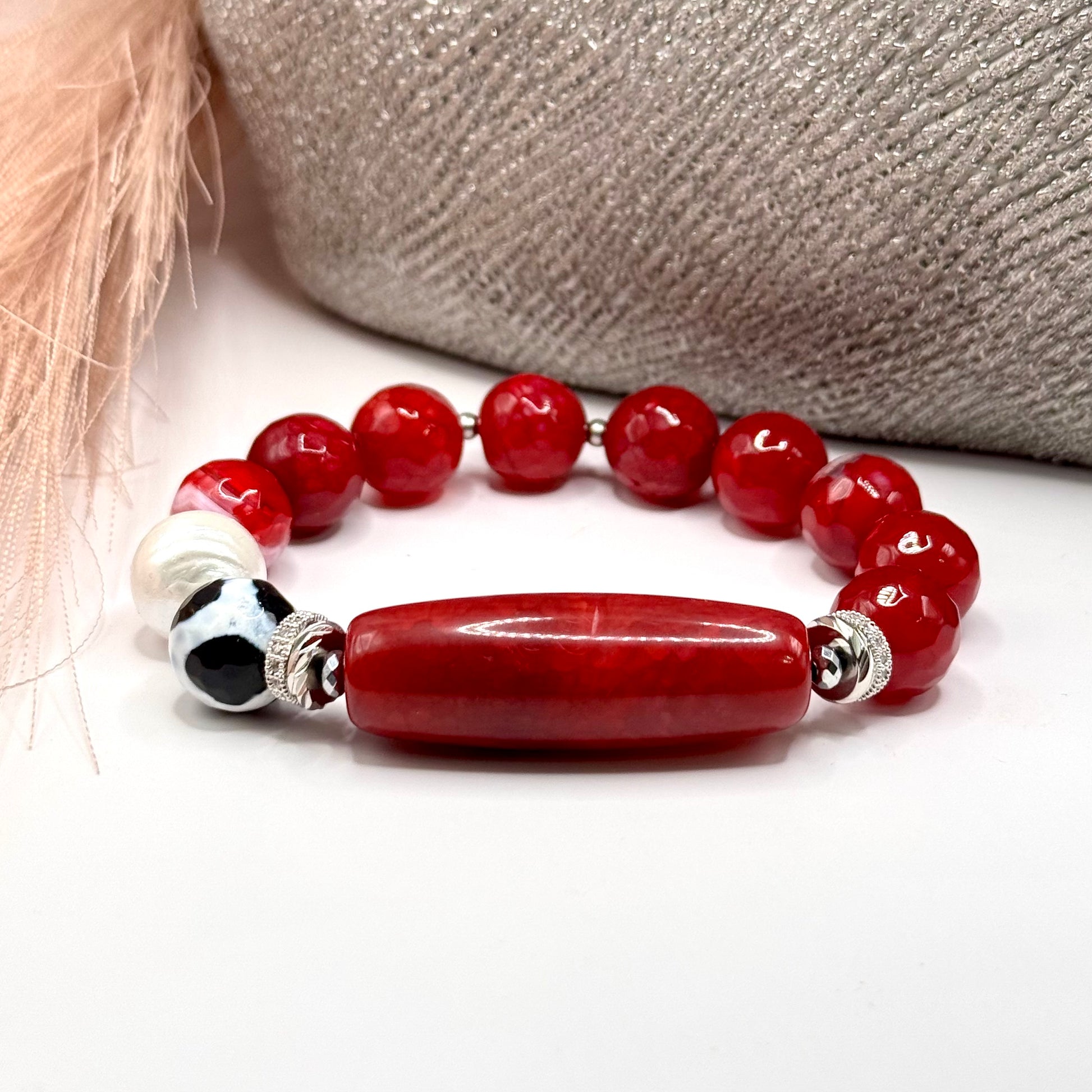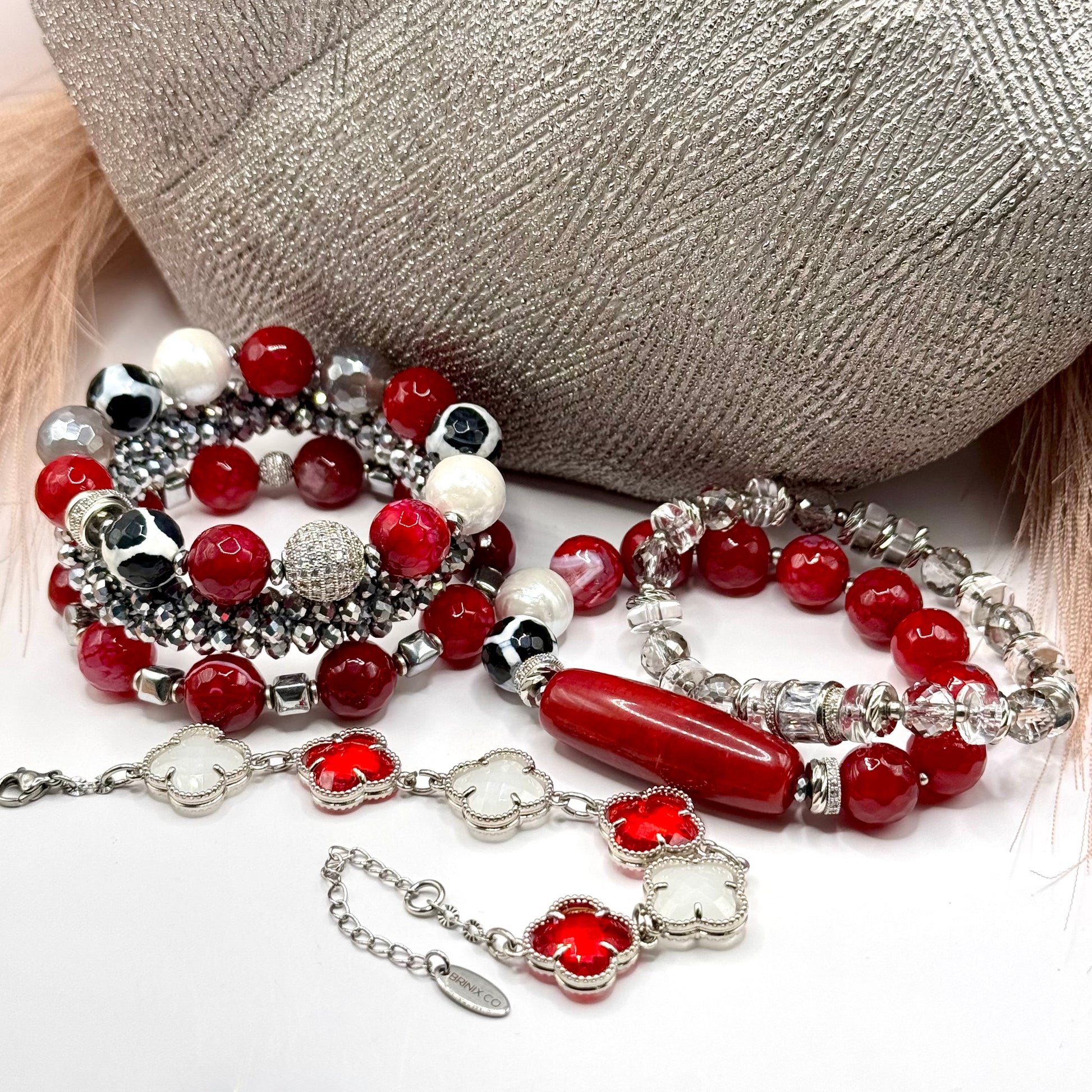 The Devastating Beauty Collection features 8 & 12mm beads and the following gemstones: Agate, Shell Pearl and Hematite.