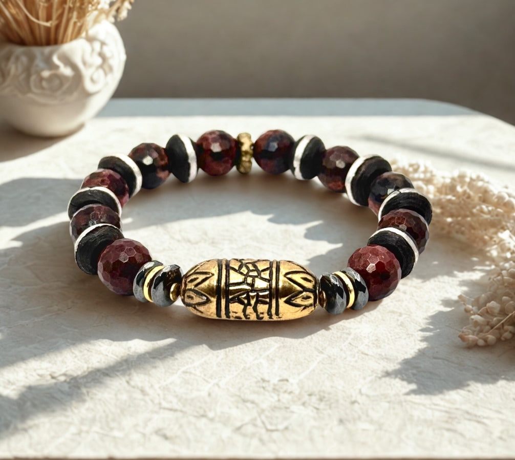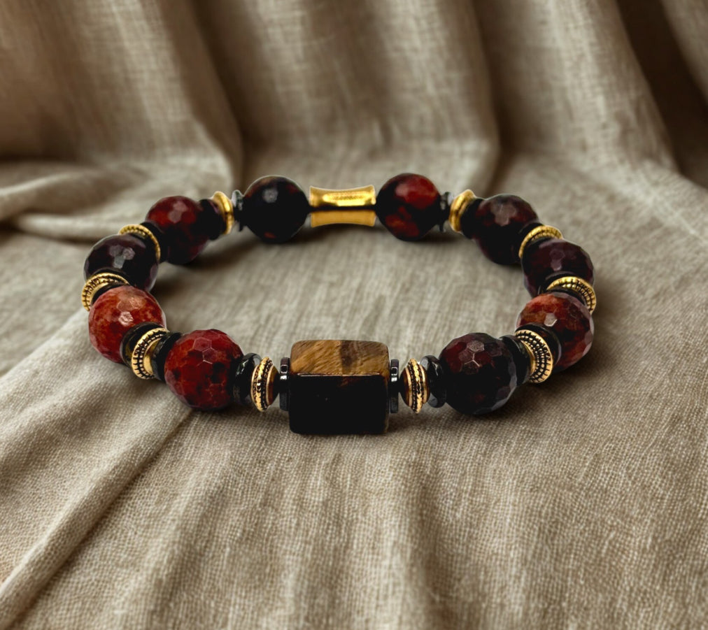 Experience the perfect balance that brass brings to our exquisite Forge Men's Bracelet. This handcrafted masterpiece features 12mm faceted orange Sodalite stones, and is expertly combined with African Ebony wood and brass. The elastic design ensures a comfortable and flexible fit, making it an ideal accessory for any man.
