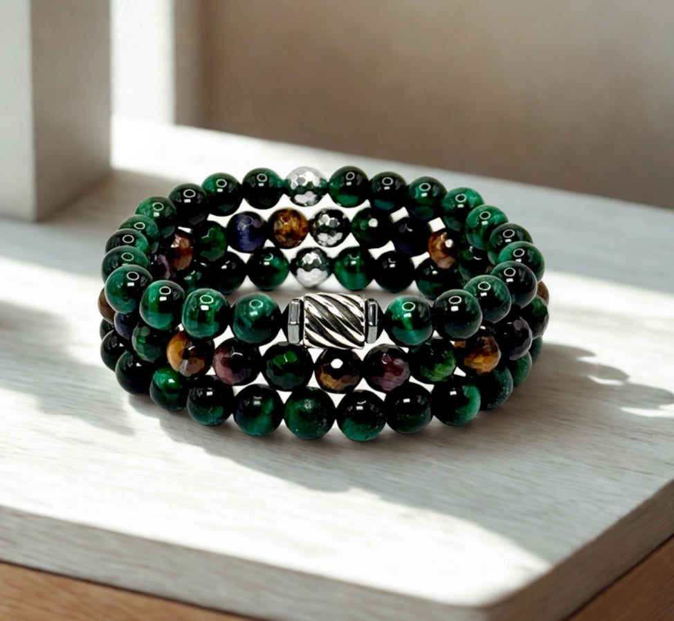 Introducing sleek and sophisticated variation to our Tiger Eye stone men's bracelet that is destined to elevate any ensemble. Crafted with meticulous attention to detail, this bracelet set features 8mm emerald green Tiger Eye stones along with a mix or other colors and captivating stainless steel centerpiece. The elastic design ensures a comfortable and secure fit for most wrist sizes.