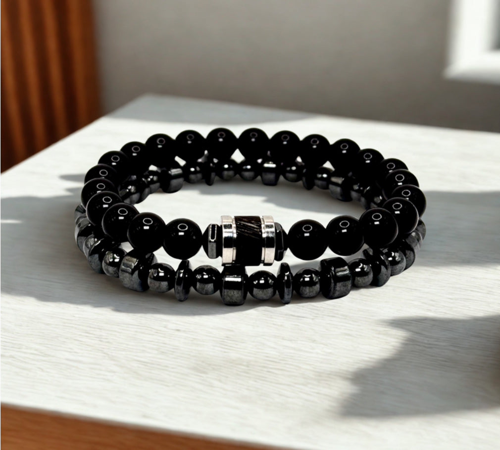 Introducing this sleek and sophisticated Onyx and Hematite gemstone duo. It's one of the newest adds to our Men's Fall Collection that is destined to elevate any ensemble. Crafted with meticulous attention to detail, this bracelet set features 8mm Onyx stones paired perfectly with a second 8mm Hematite bracelet and a captivating stainless steel centerpiece. The elastic design ensures a comfortable and secure fit for most wrist sizes.