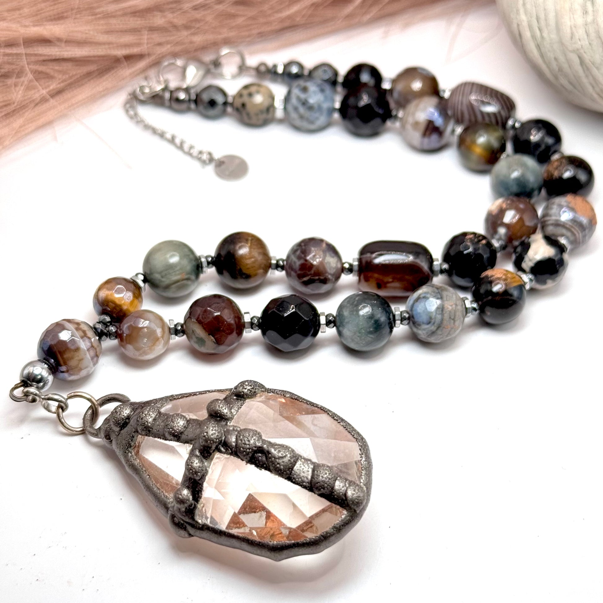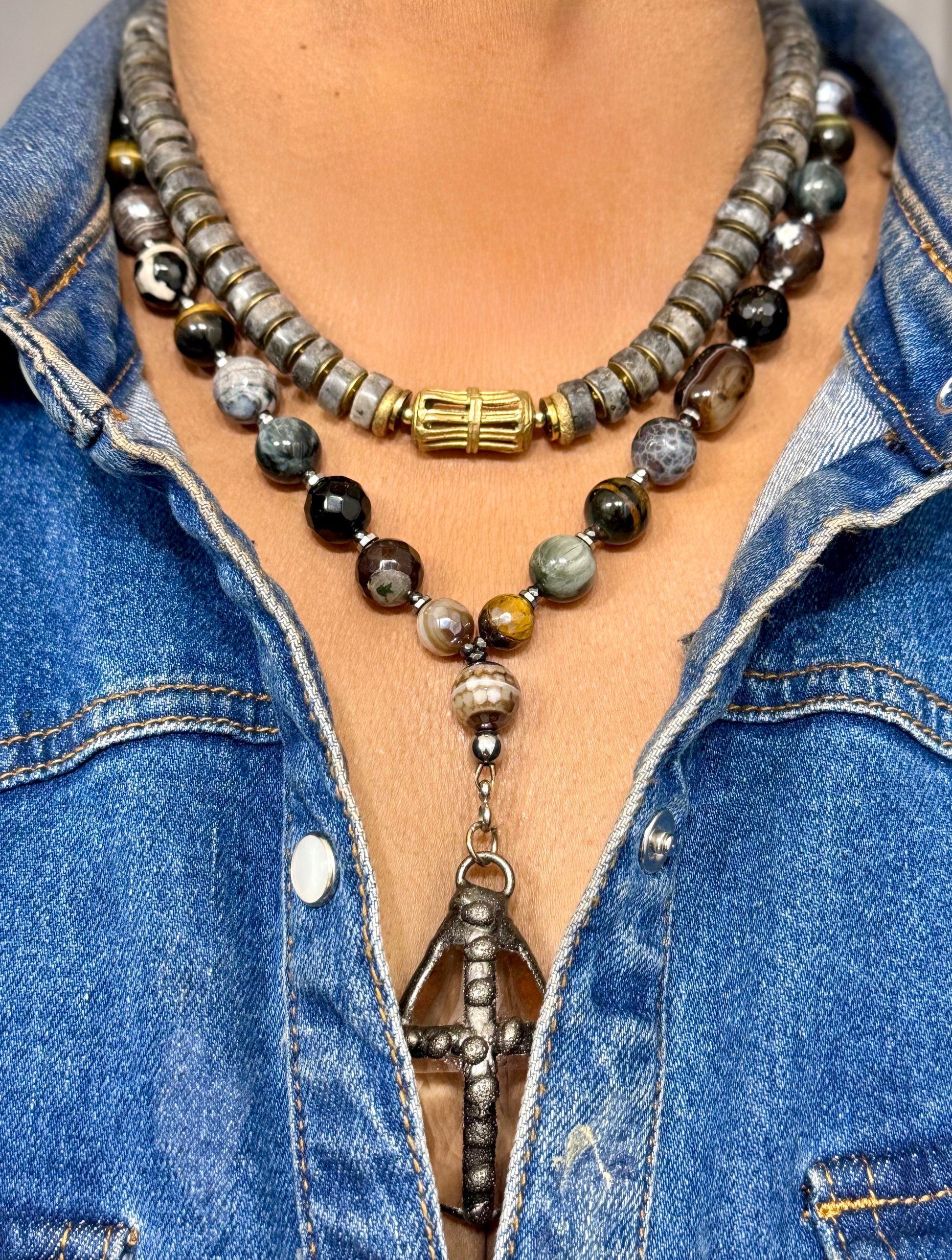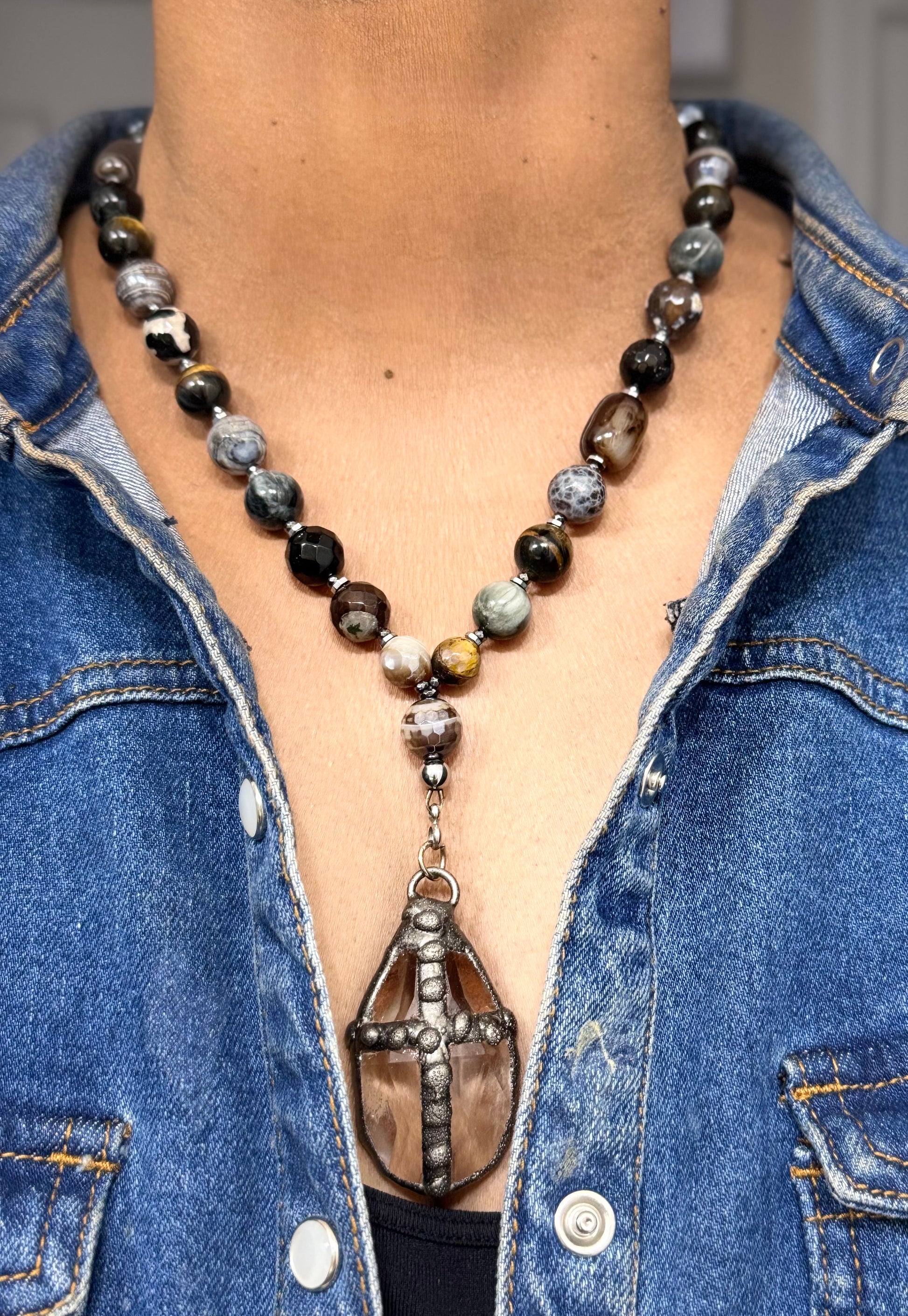 This purchase is for one neutral toned necklace with a crystal cross pendant. Pairs well with our Katina labradorite and brass necklace pictured below.