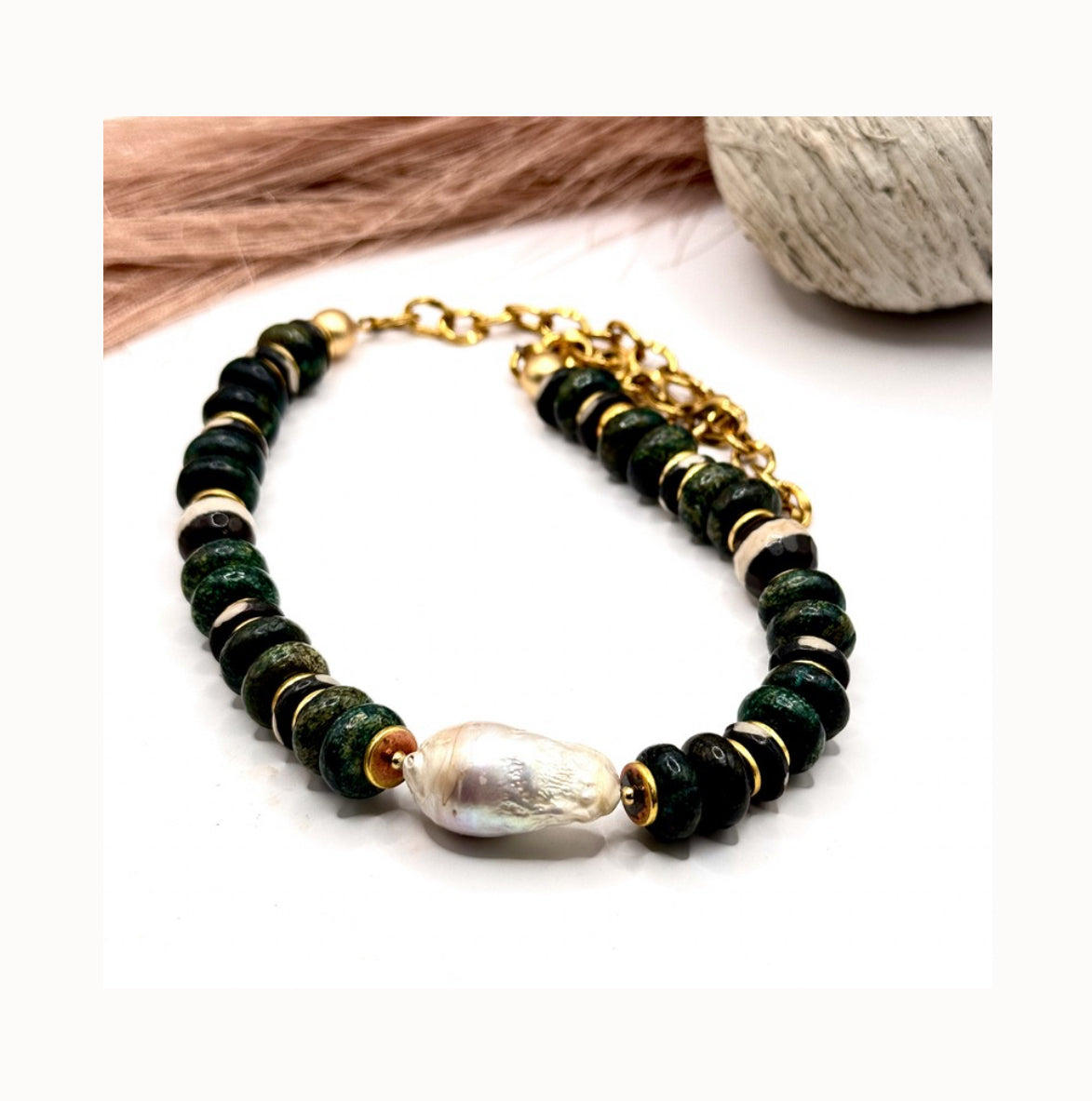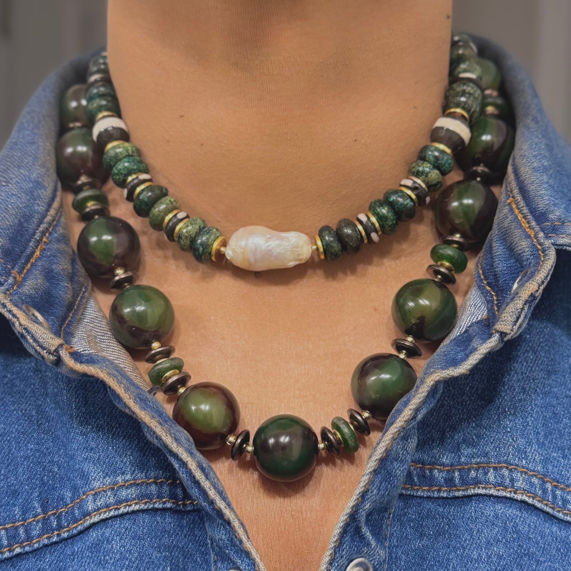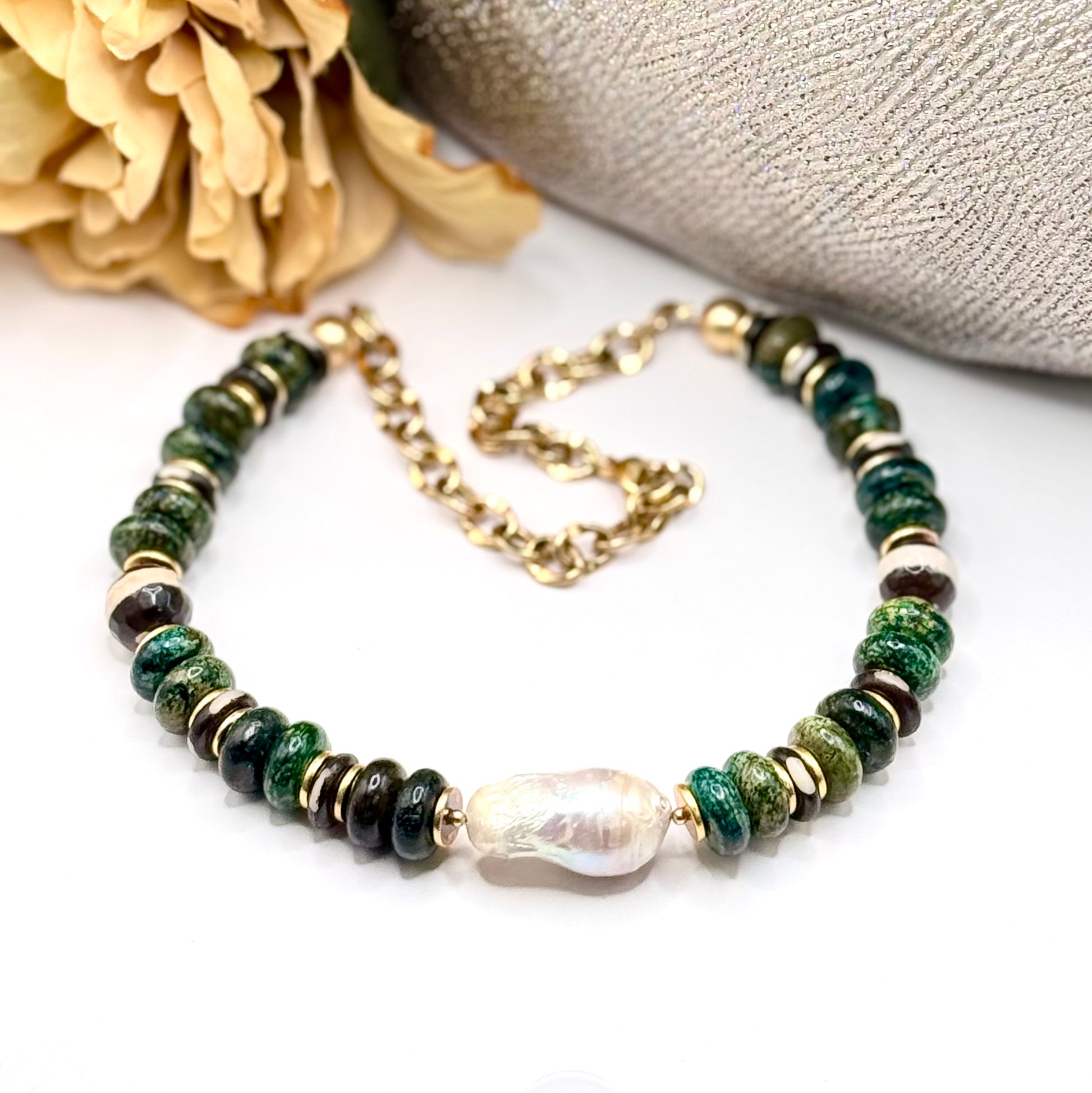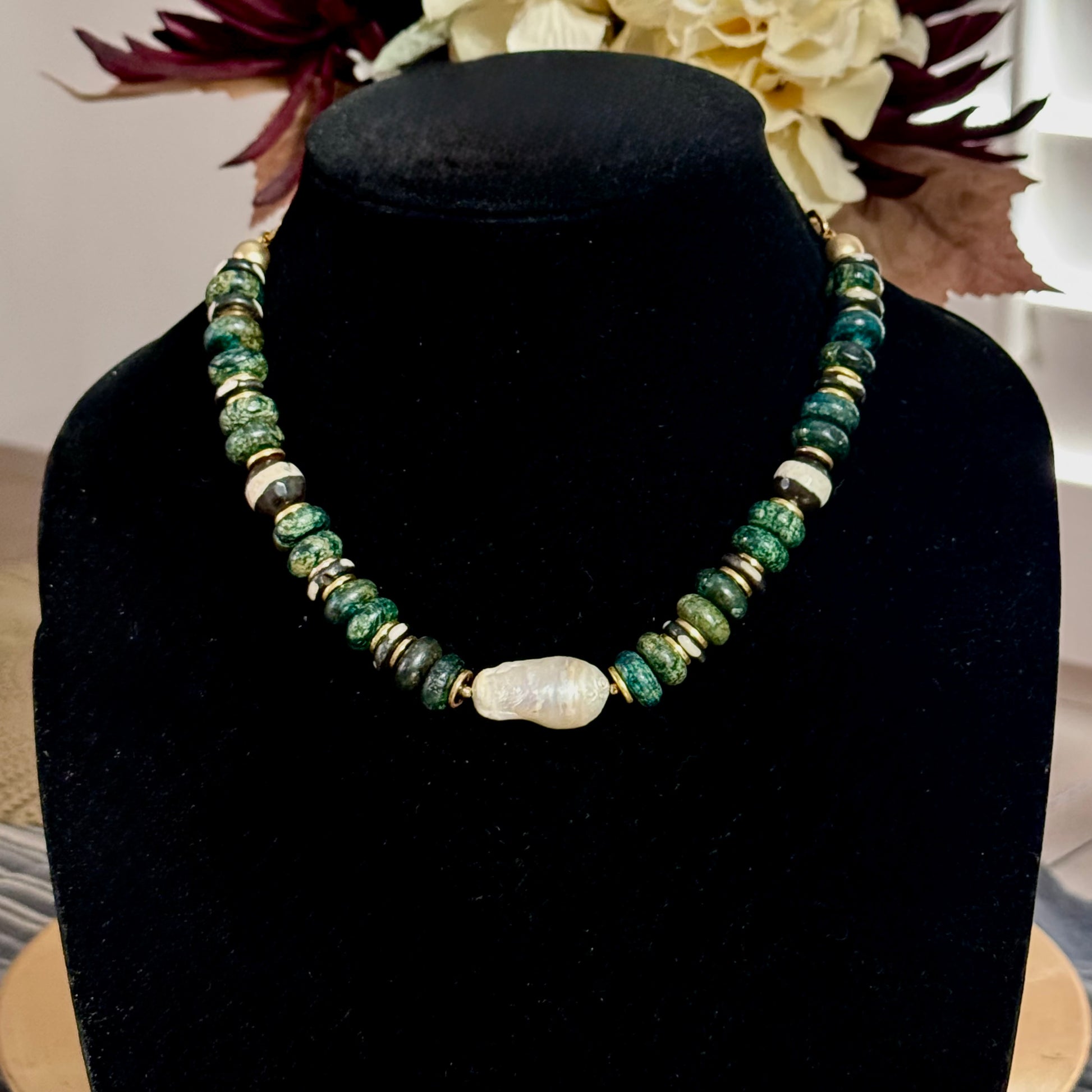 This purchase is for one natural gemstone, Magnesite Turquoise necklace with a Freshwater Baroque Pearl centerpiece. Pairs well with our Holland necklace , pictured below.