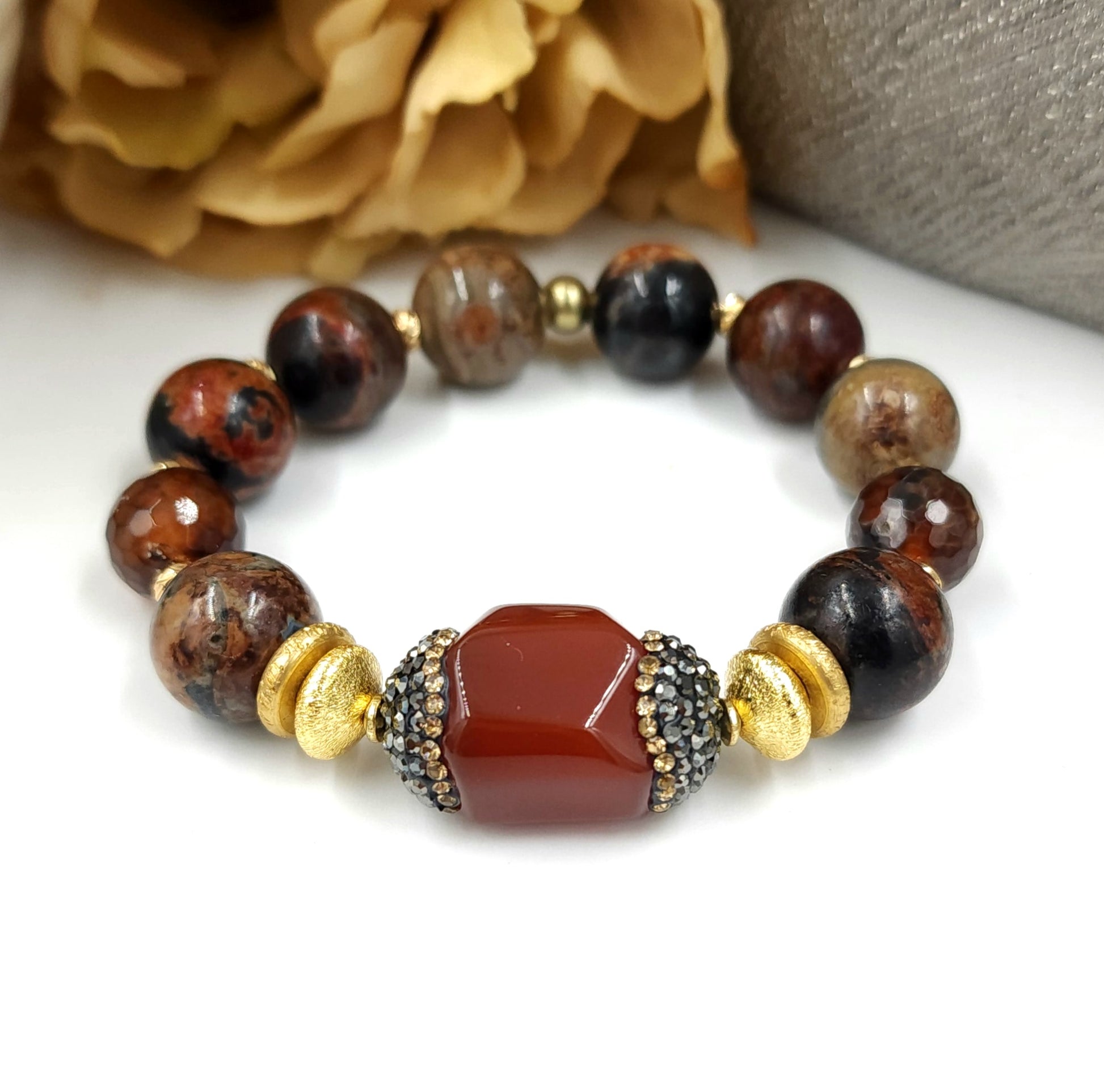 14mm Ocean Agate gemstone beads with a rhinestone encrusted Carnelian centerpiece. Absolutely stunning!