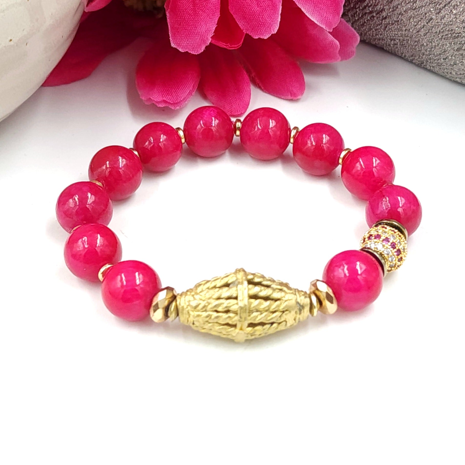 12mm Pink Jade stretch cord, beaded bracelet. Brass centerpiece with pave and hematite accents.