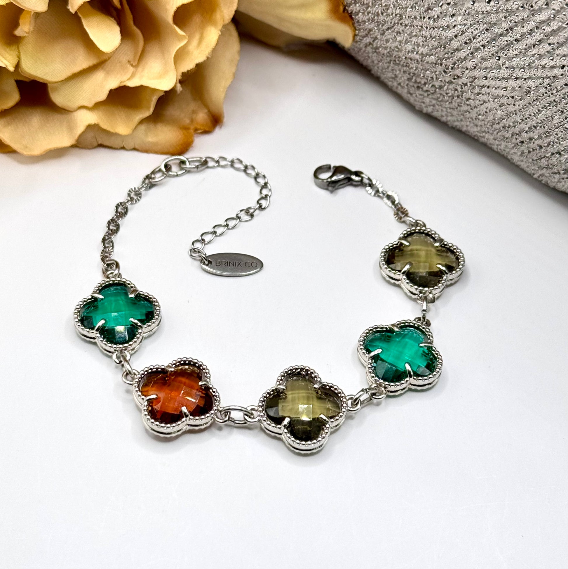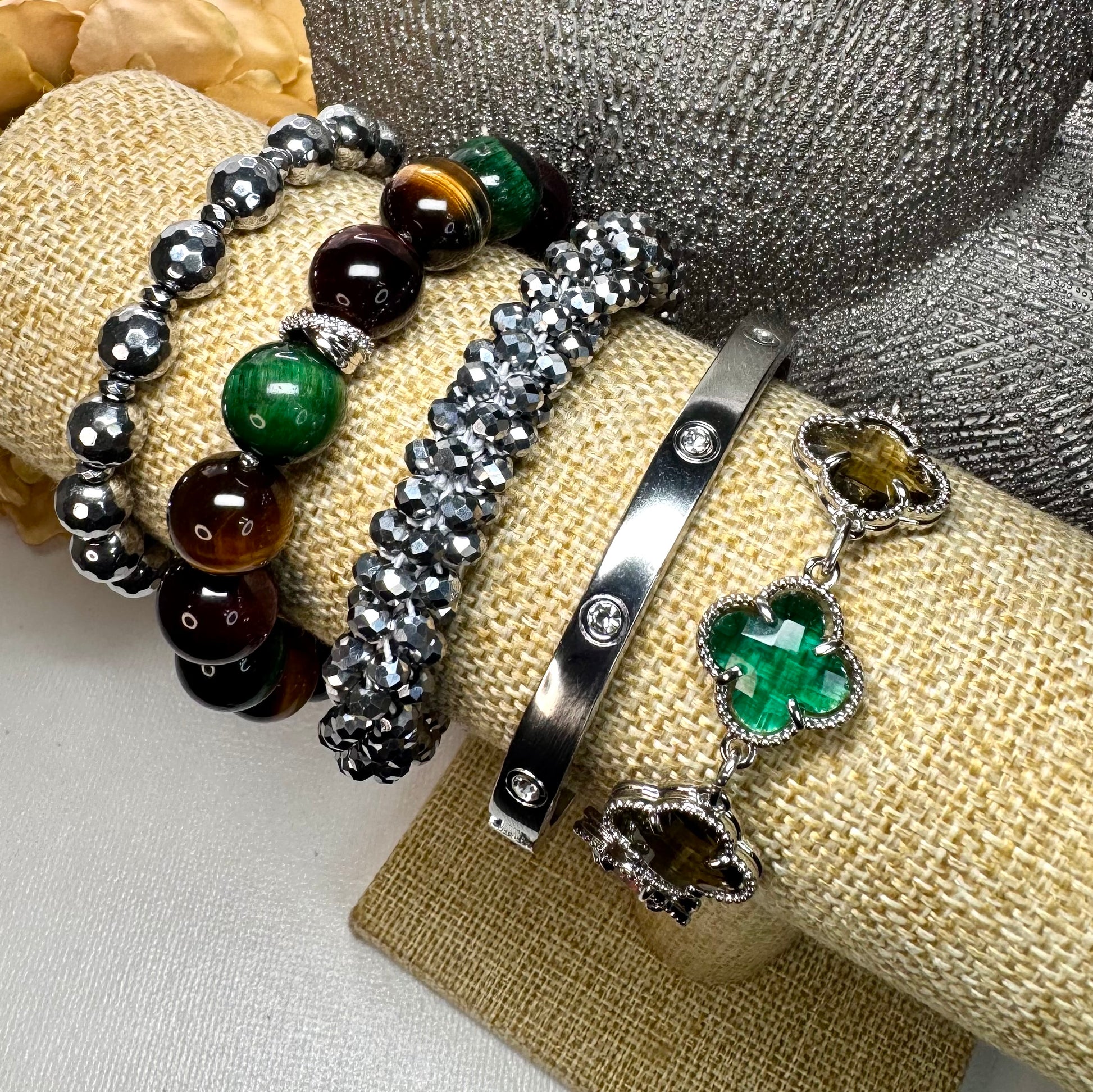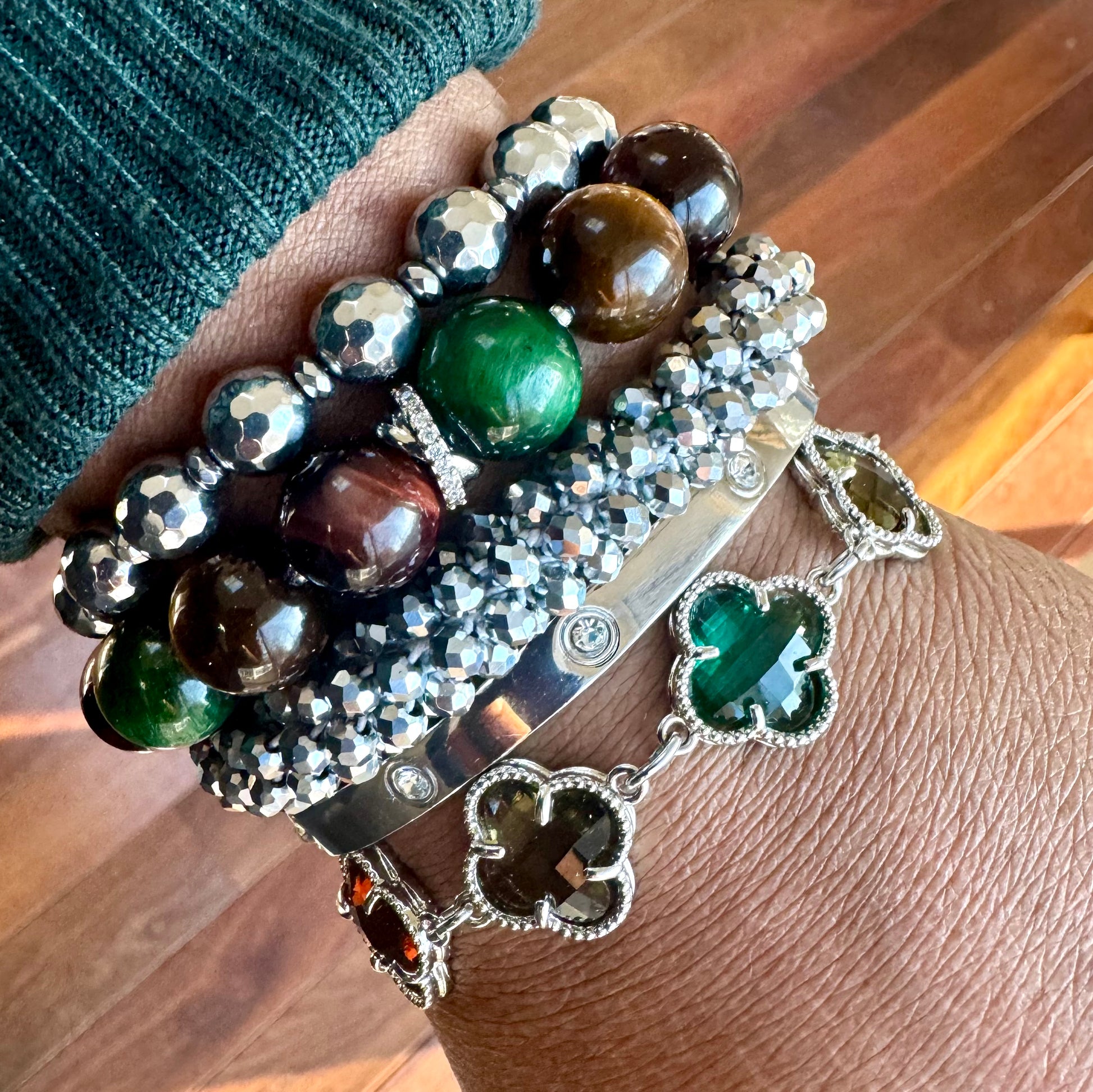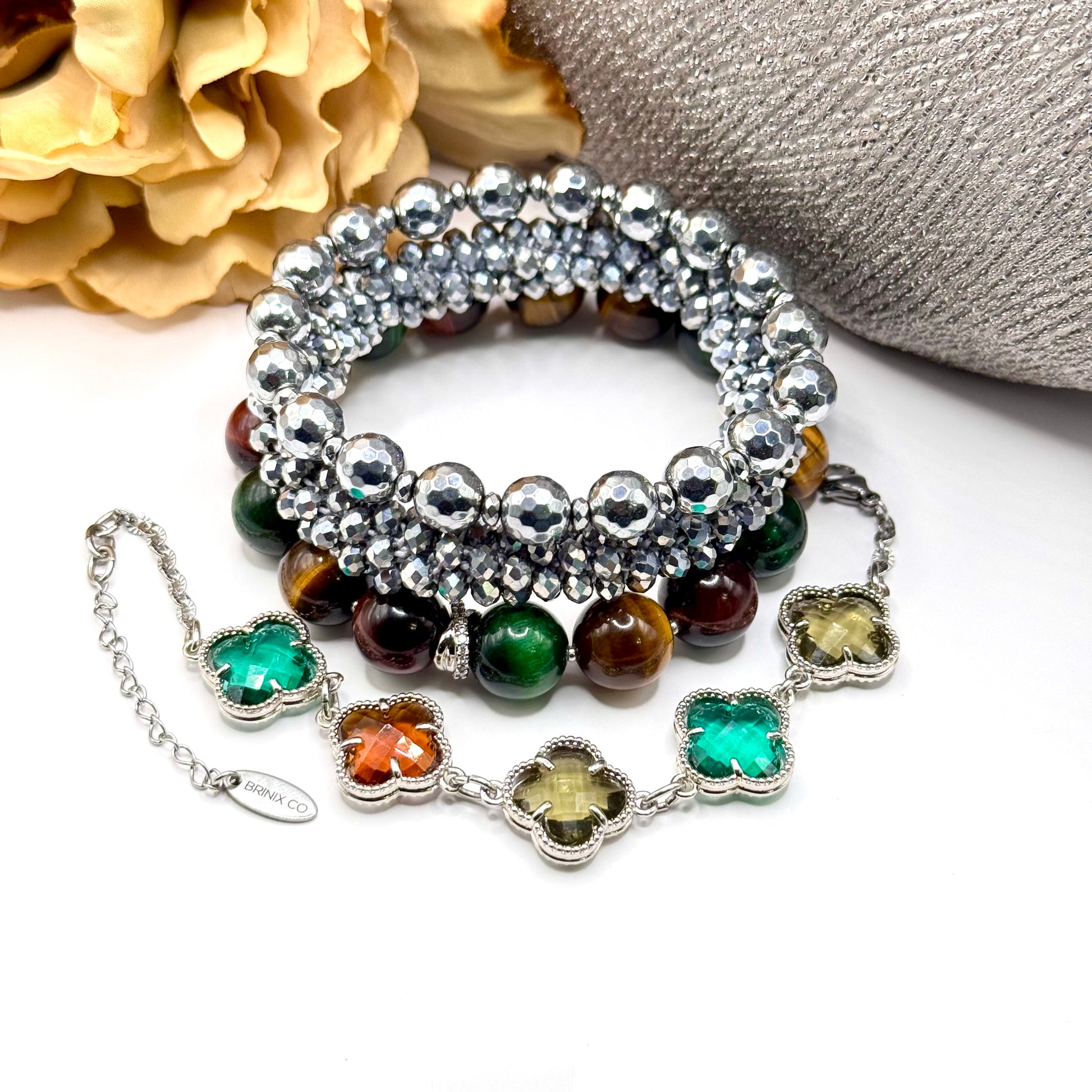 The Hunter Collection features 8, & 12mm beaded and the following gemstones: Multi colored Tiger Eye & Hematite. In addition, the collection includes 2 new items, the beaded bangle and Brinixco's custom-made Autumn Clover Bracelet.