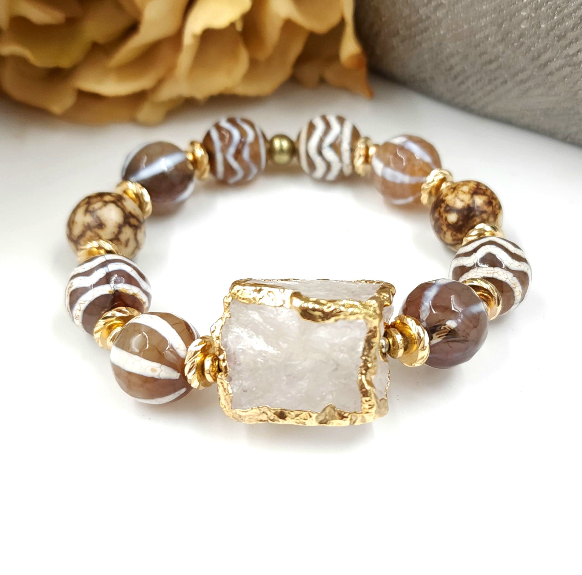 14mm Tibetan Agate & Howlite gemstone beads with a gold trimmed Clear Quartz centerpiece. Absolutely stunning!