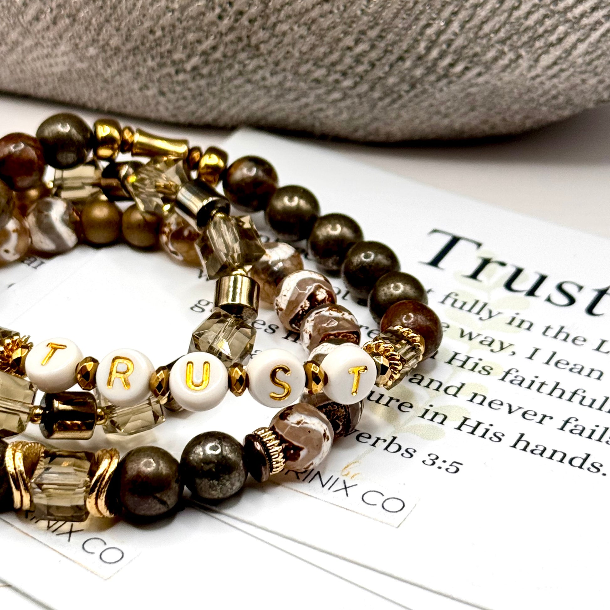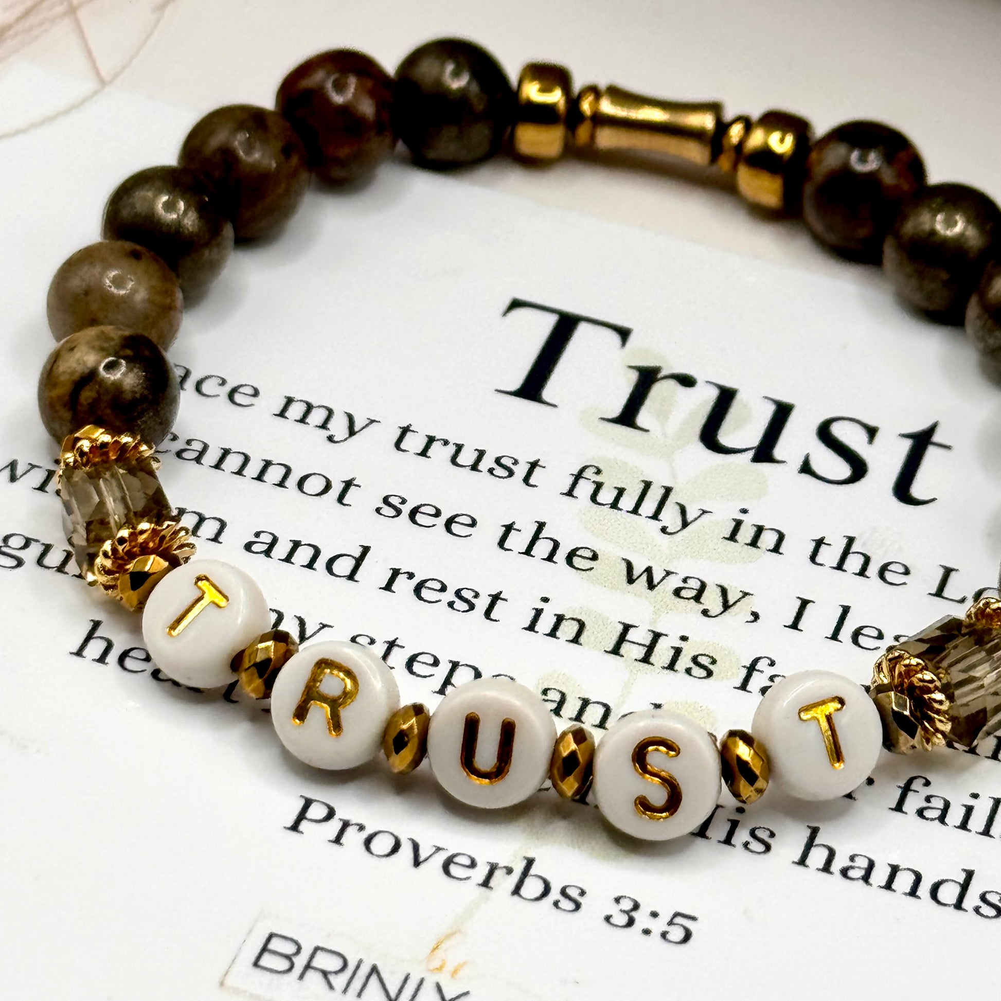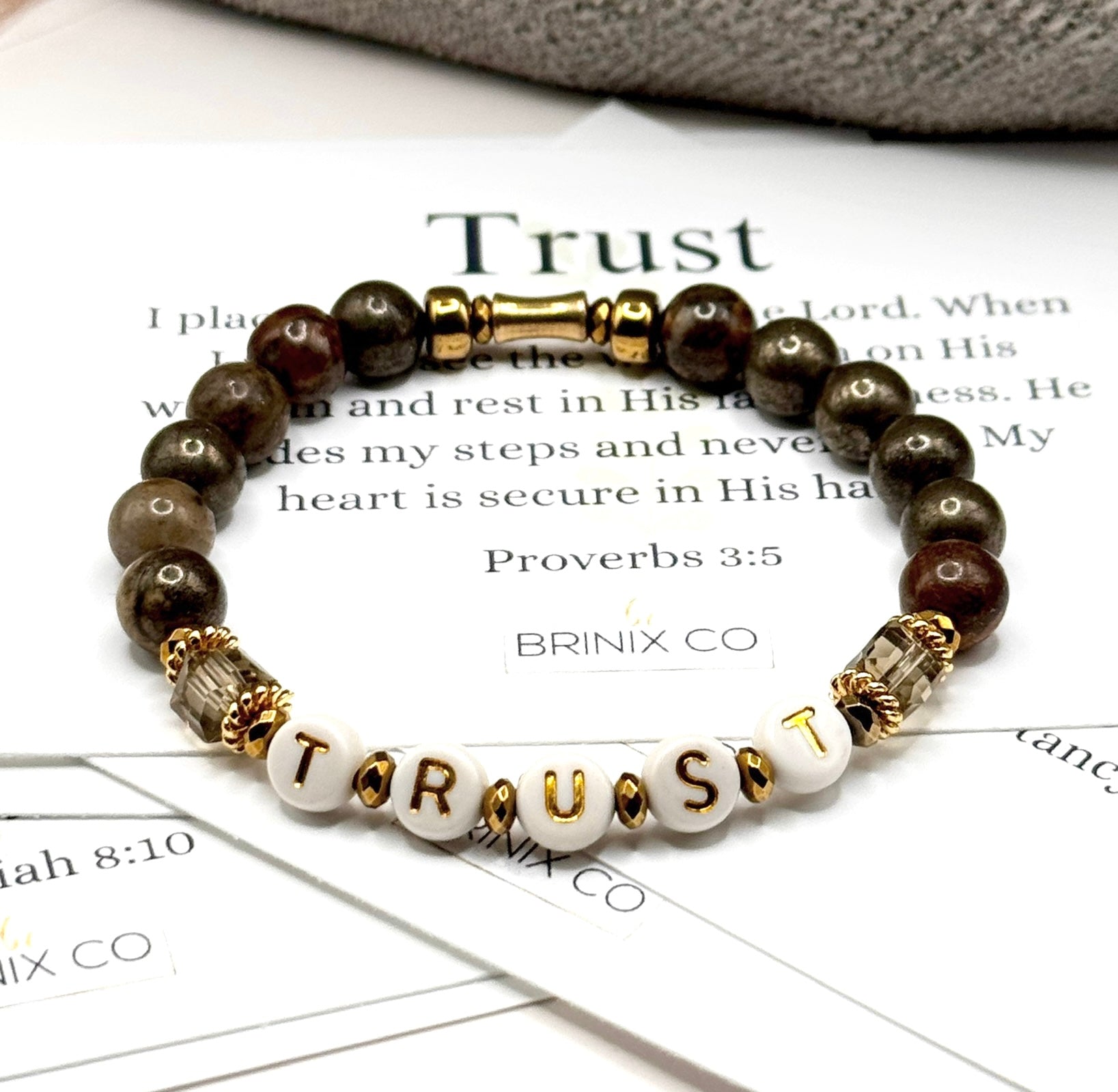 Gorgeous 8mm natural Pyrite & Hematite bracelet with the affirmation word Trust centered across the front. The bracelet can be worn as a single or purchased as a set of 3. Also included is a Trust affirmation card that includes a focal scripture. You can declare these powerful words over your life daily along with all other cards in the Affirmation Bracelet Collection.